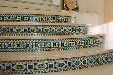 The Ayer Mansion entrance hall, with its white marble wainscoting, mosaic stair risers, and glass mosaics in the apse-like stair, recalls Tiffany's famous chapel at the 1893 Columbian Exposition in Chicago. Originally intended as an advertisement for his mosaic glass work, Tiffany "came to regard (the chapel) as his artistic chef d'ouvre." This chapel, seen by 1.4 million visitors and awarded 54 medals, was the "pinnacle of his work" in the genre of mosaic. Some of the chapel elements are on display at the Morse Museum of American Art in Winter Park, Florida. At the Ayer Mansion, a comparable interior can be experienced in its entirety.