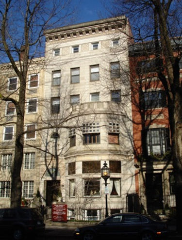 Both the exterior and interior of the Ayer Mansion were unusually progressive for turn-of-the-century Boston and would have distinguished the Ayers from their contemporaries as forward-looking and worldly patrons. The street elevation of the light-colored granite-faced house, with its smooth, flat surfaces ornamented by bands of mosaic panels set in limestone, introduced a modernizing aesthetic to Boston's Back Bay. The Back Bay, an area studied by Bainbridge Bunting, contained "after 1895 only one large… house, 395 Commonwealth Avenue,… built in a nonhistoric style." Architectural historian Douglass Shand-Tucci also concluded that the building was the first in the area to display "progressive" tendencies. The austere, white form, with smooth surfaces punctuated by windows devoid of surrounds, but accented with mosaics of brilliant color, resembles more closely designs by Joseph Olbrich in Austria and Germany or Charles H. Townsend in England than anything in Boston at the time.